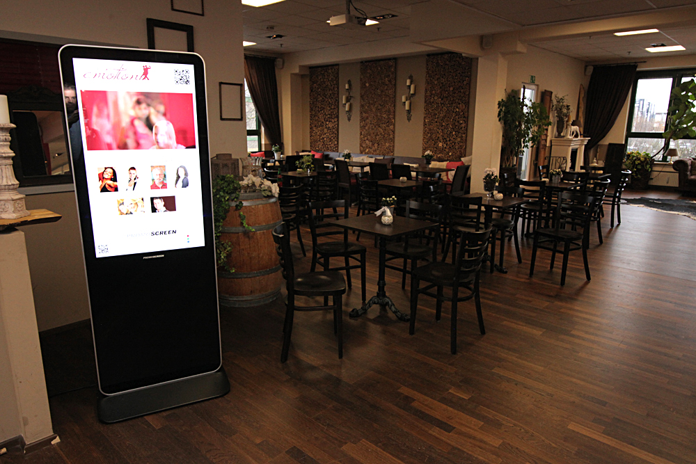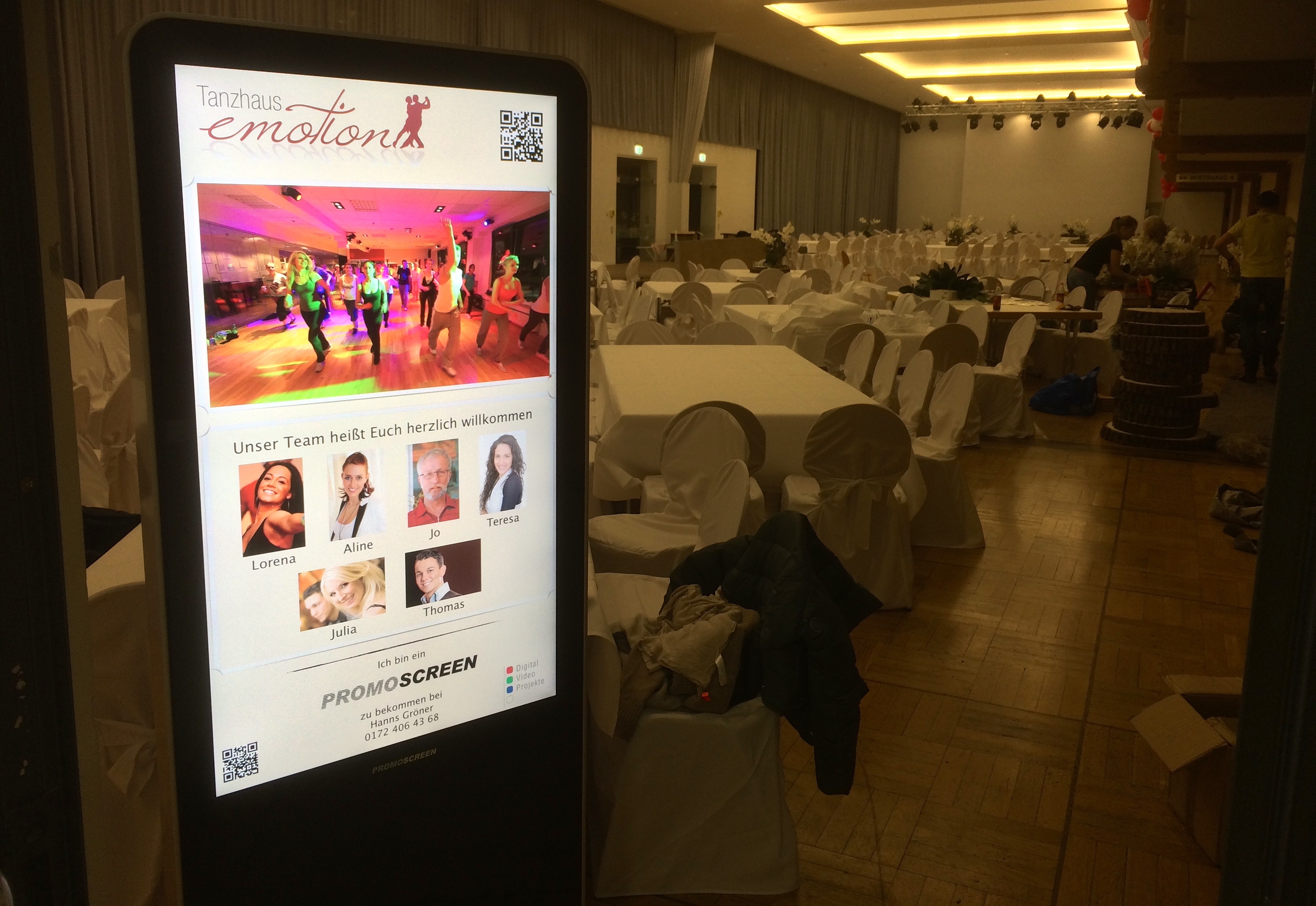 Zusammen mit dem Geschäftsführer des Lieferanten bringen wir das Gerät zum Tanzhaus. In nur wenigen Minuten ist der Promoscreen ausgepackt, nach oben getragen und aufgestellt. Auch die Installation eines von uns individuell für das Tanzhaus Emotion designten Screens inklusive Film ist in wenigen Minuten erledigt. Der Promoscreen wird nur an das Stromnetz angeschlossen, der Film vom USB Stick auf den lokalen Speicher des Promoscreens kopiert und als Endlosschleife gestartet. Das Timing könnte nicht besser sein – es ist Pause und die Kursteilnehmer kommen aus dem Tanzsaal. Wir sind gespannt, wie die Tänzer auf das Gerät reagieren werden…