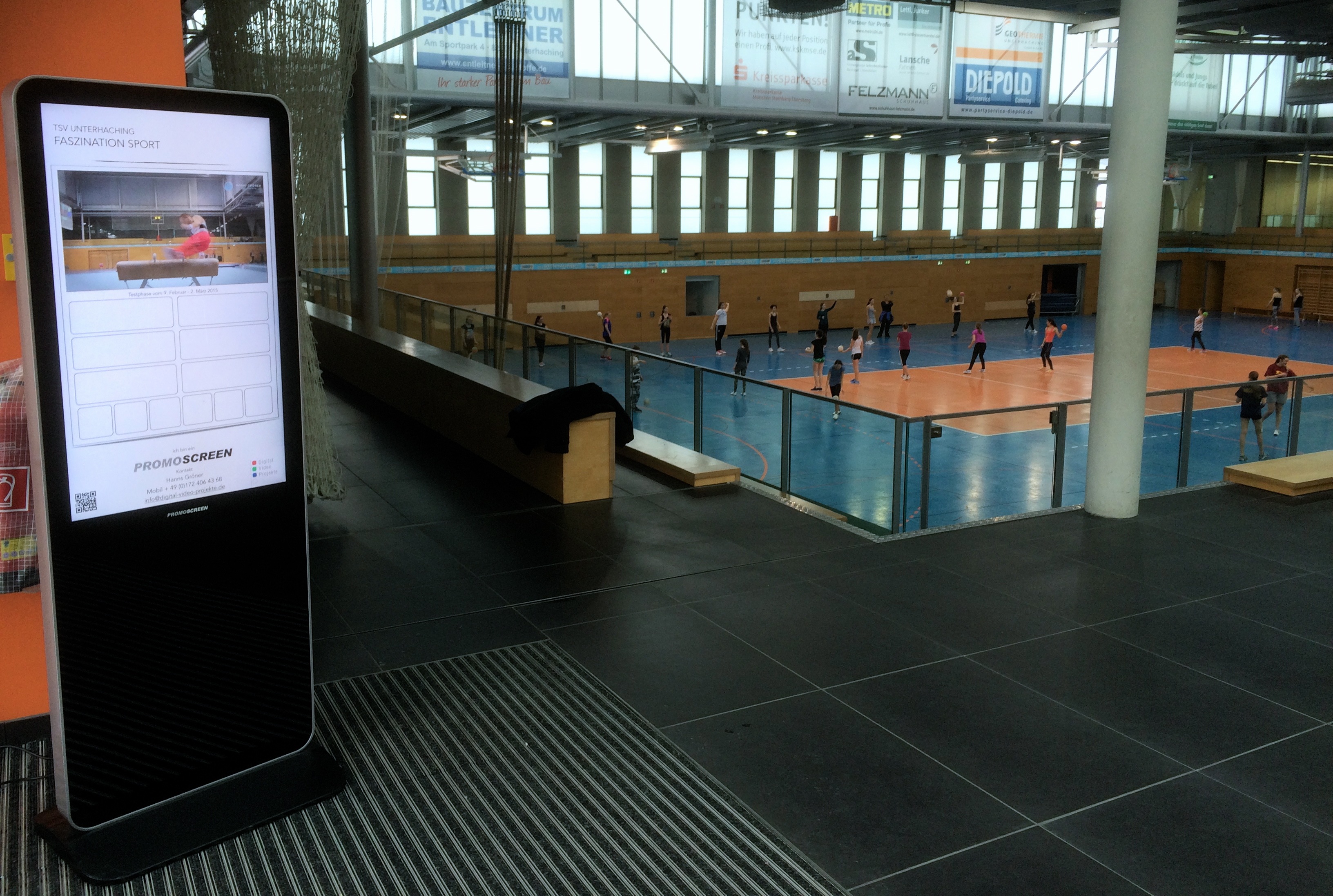 Nun steht der Promoscreen an der Stelle für die er eigentlich geplant war: hier soll er die Vielfalt des Sports zeigen und Hallenbesucher begeistern und informieren. Ab heute beginnt die dreiwöchige Testphase während der sich die Beteiligten (Gemeinde, Verein, Sponsoren und Projektleitung) darüber einig werden wollen, ob sie diese Form der Darstellung haben möchten (oder nicht). Spannend! Und auf jeden Fall einen Versuch wert. Nun beginnt die Ansprache und Information der Sponsoren.