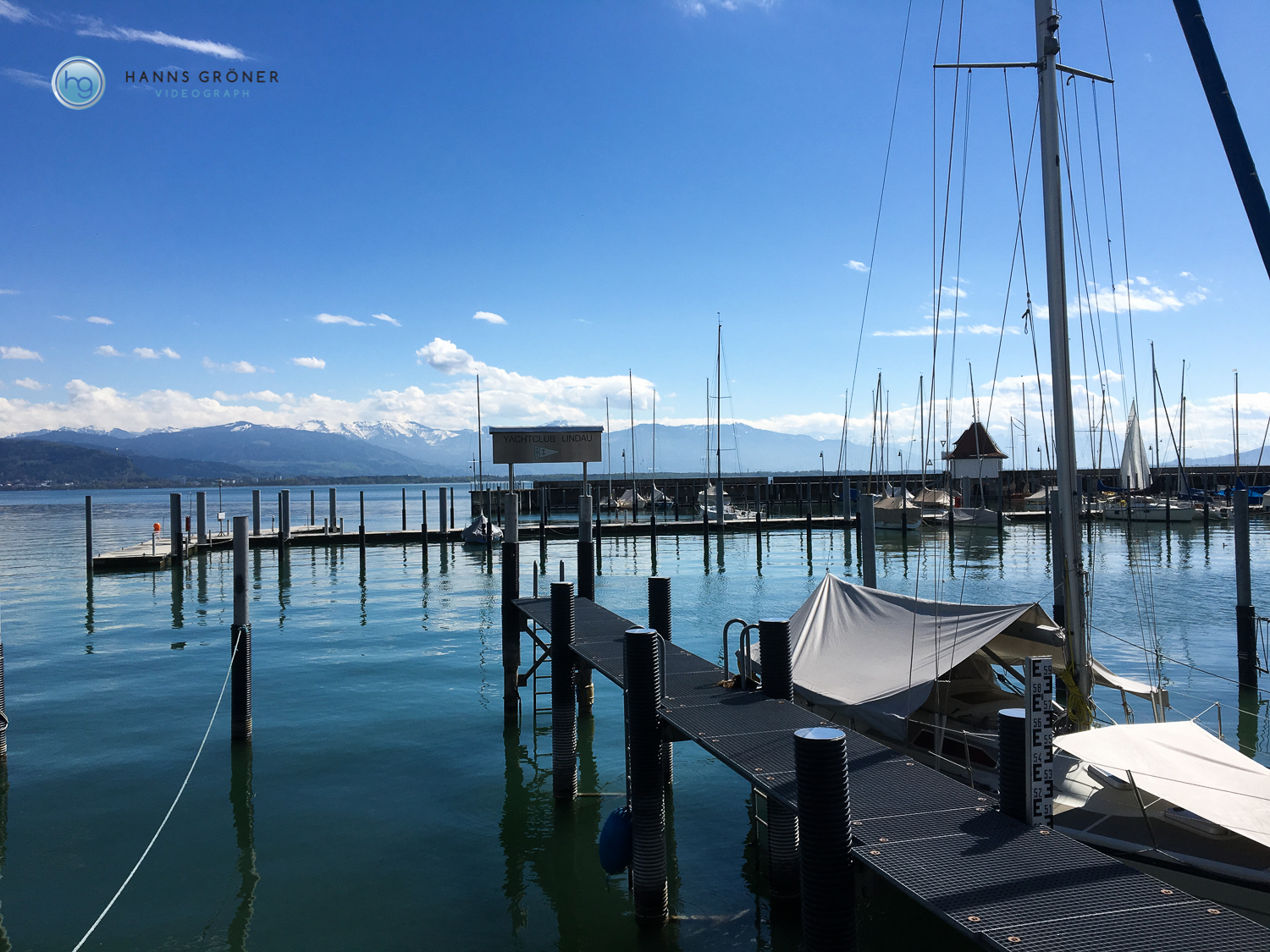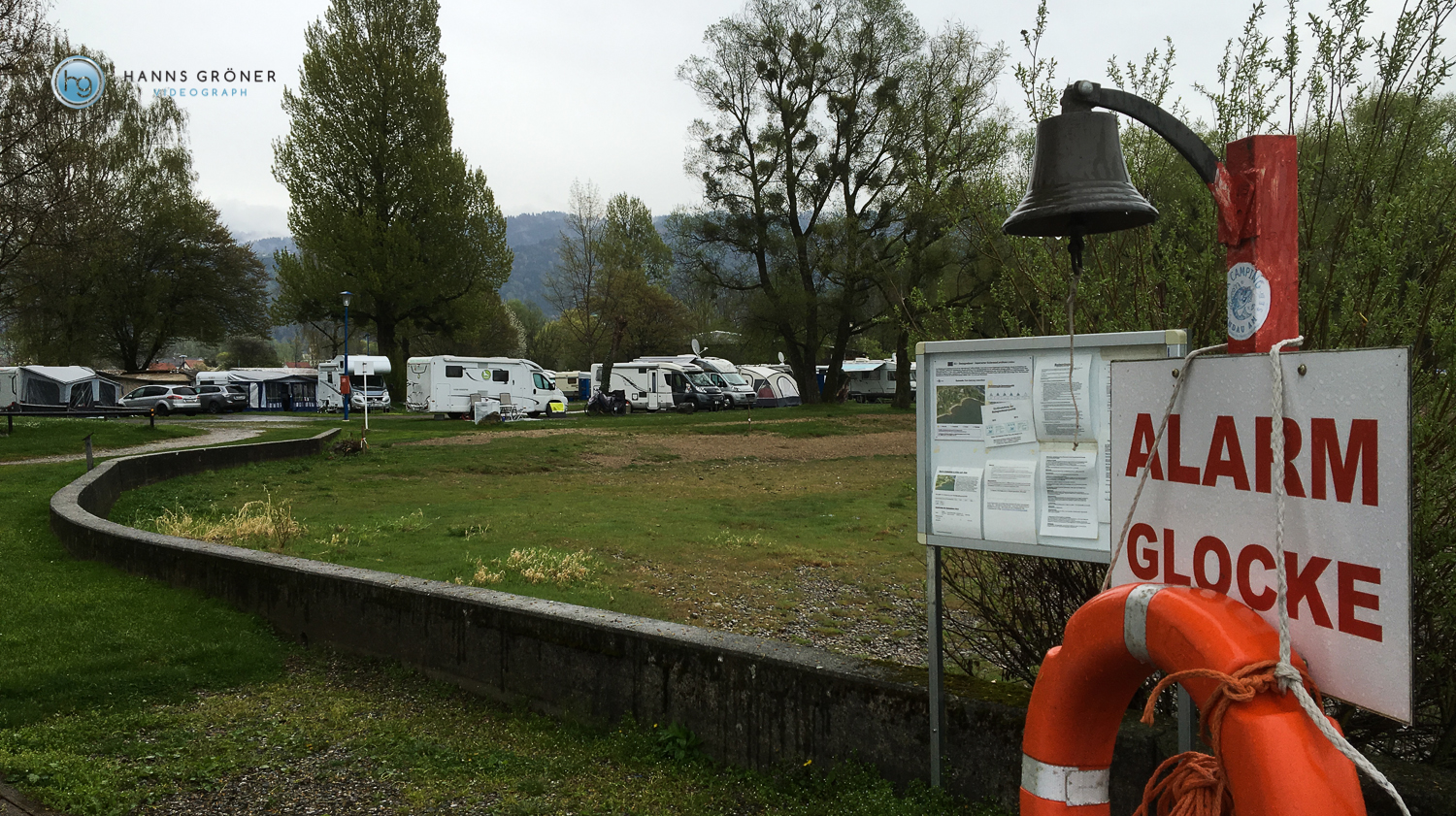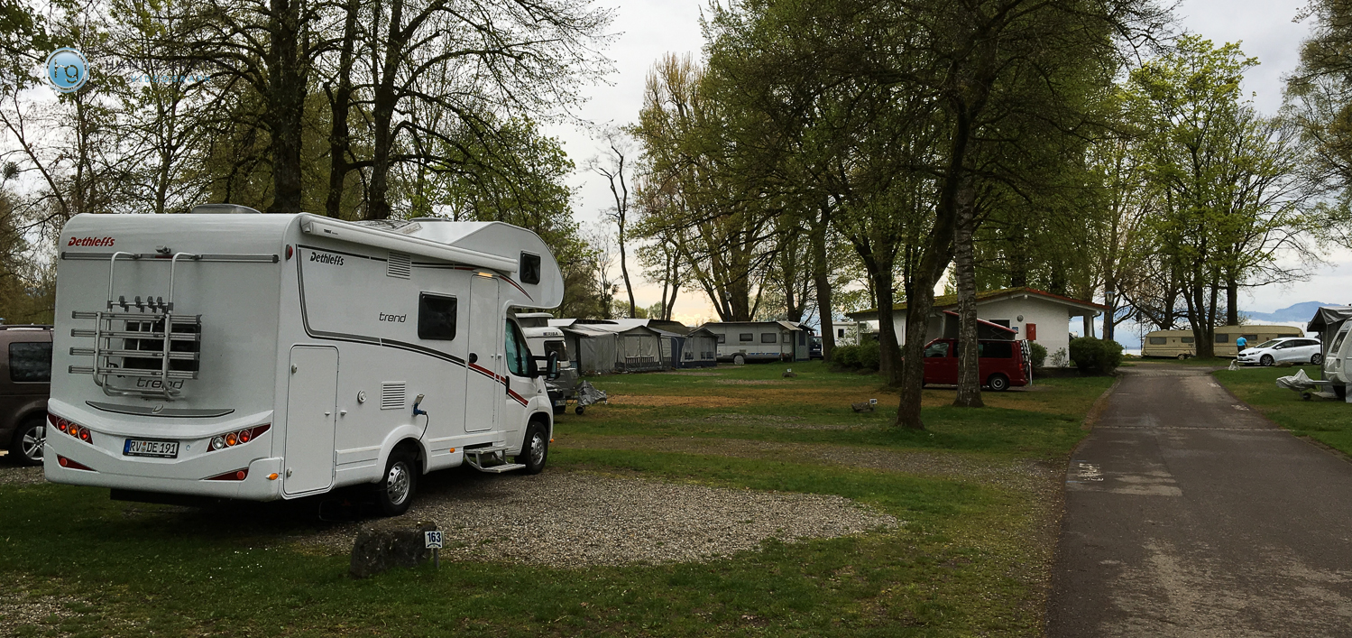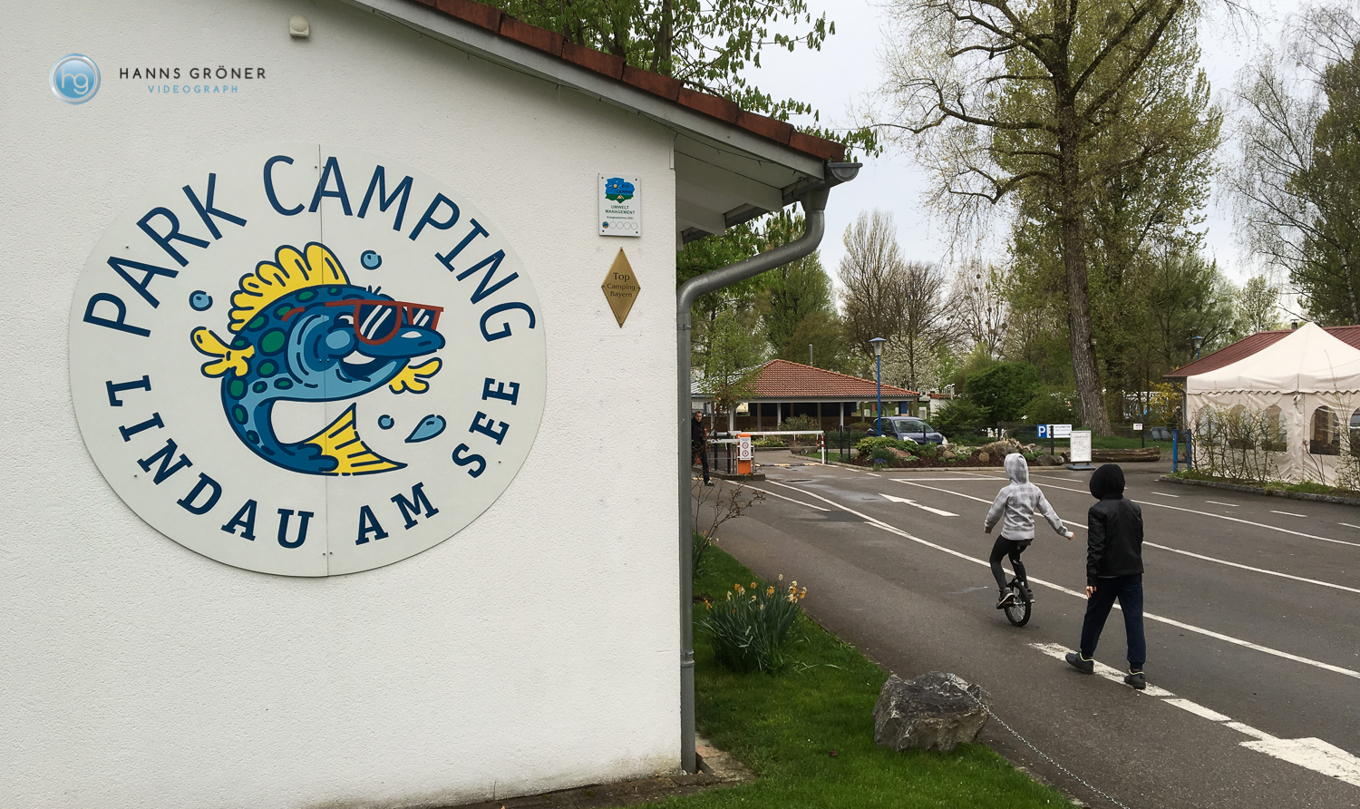 Der Campingplatz ist nur mäßig besucht aber – trotz des nicht gerade einladenden Aprilwetters – bei weitem nicht leer. Alles macht einen sehr gepflegten Eindruck. Der See ist nur ein Paar Schritte entfernt. Vom Steg hat man einen schönen Blick auf die umliegenden Berge, den See und die Stadt Lindau.