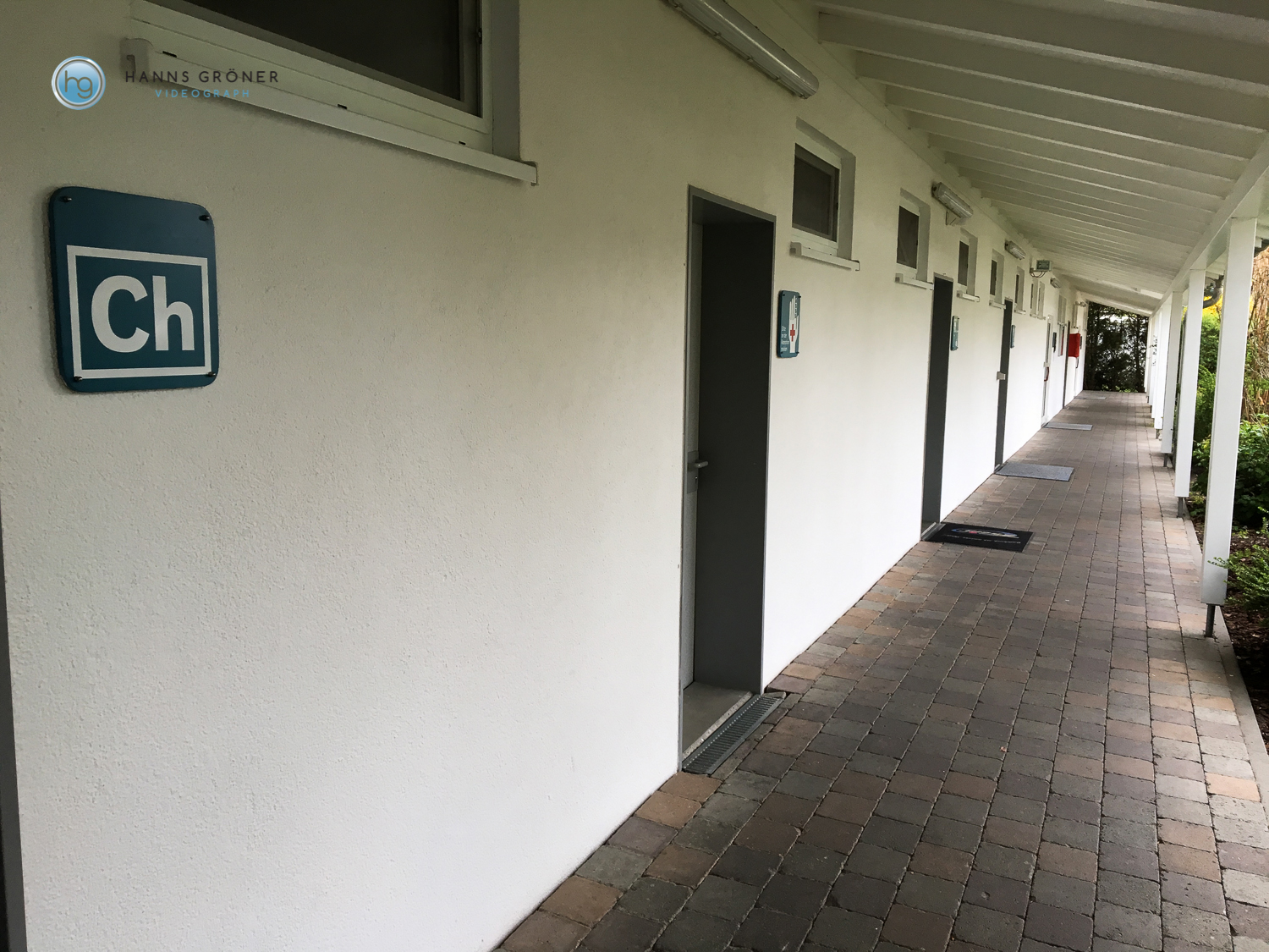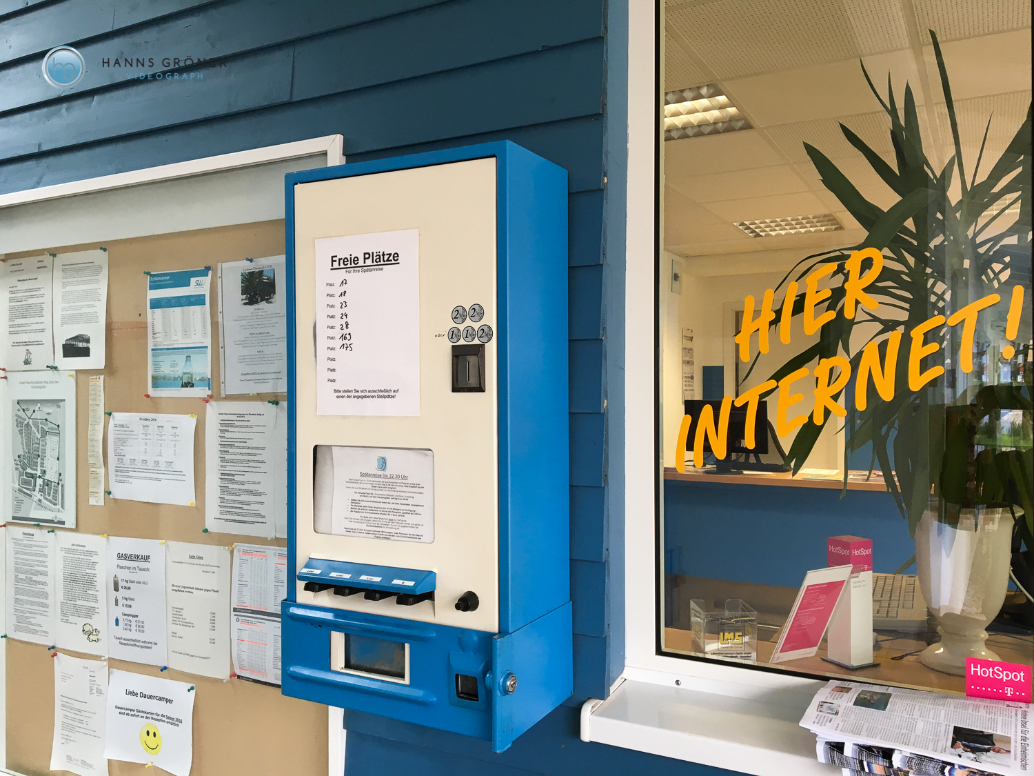 Wir erreichen den Campingplatz gegen 20:15. Die Rezeption ist (ein wenig zu unserer Überraschung) nicht mehr besetzt. Aber das Einchecken funktioniert dennoch problemlos. Neben dem Büro sind Einfahrtkarten und Informationen für Spätankommende vorbereitet. Einfach Karte nehmen und auf einen der Stellplätze fahren.