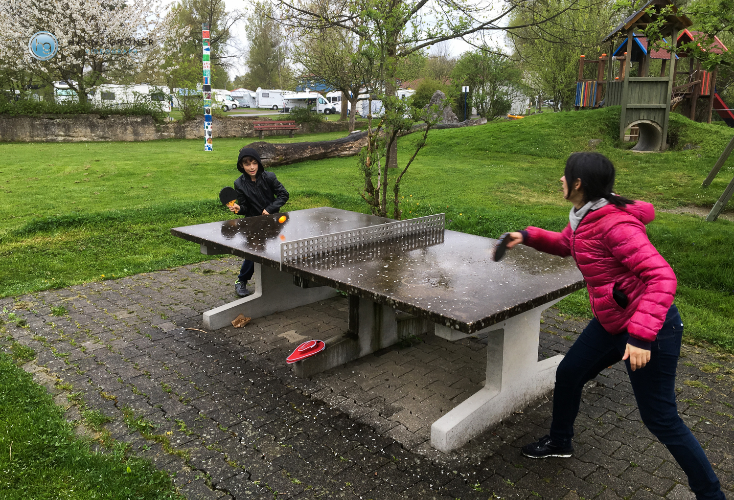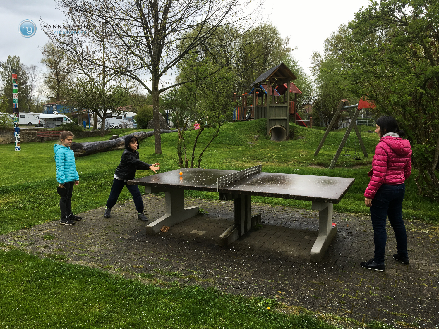 Am nächsten Morgen ist es bewölkt und regnerisch. Zum Glück ist es nicht allzu kalt und der Weg zu den nahe gelegenen Duschen nicht weit. Auch der Waschbereich scheint noch recht neu, gepflegt und sauber. Nach dem Umziehen und einem kleinen Frühstück in der nahe gelegenen Bäckerei (ca. 150m außerhalb des Platzes) haben wir Zeit für Spiele mit den Kindern. Es regnet nur ab und zu sehr leicht und so spielen wir Tischtennis und Billard…