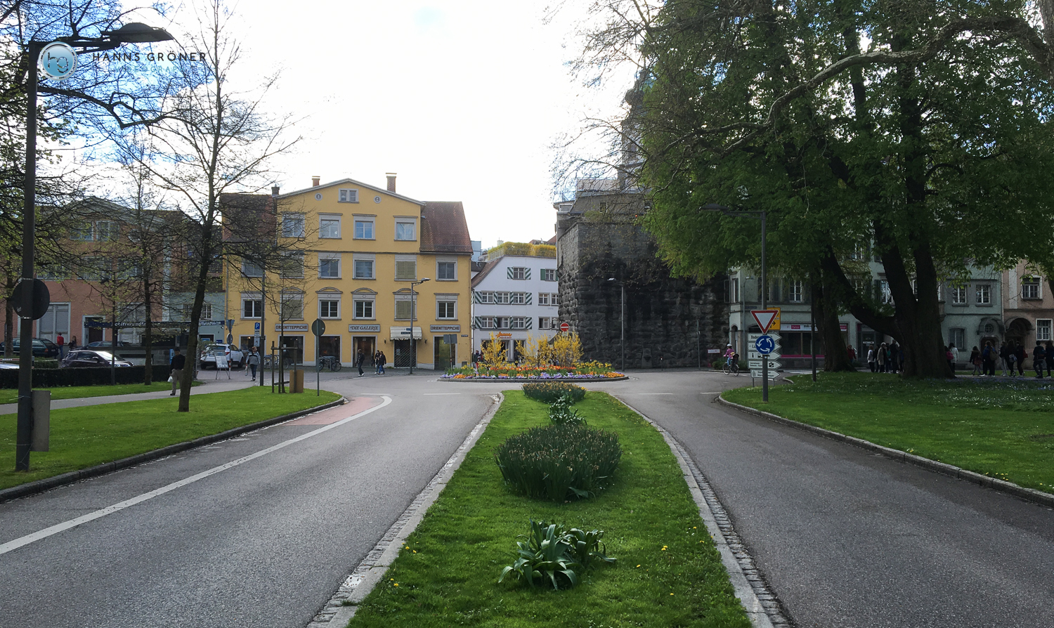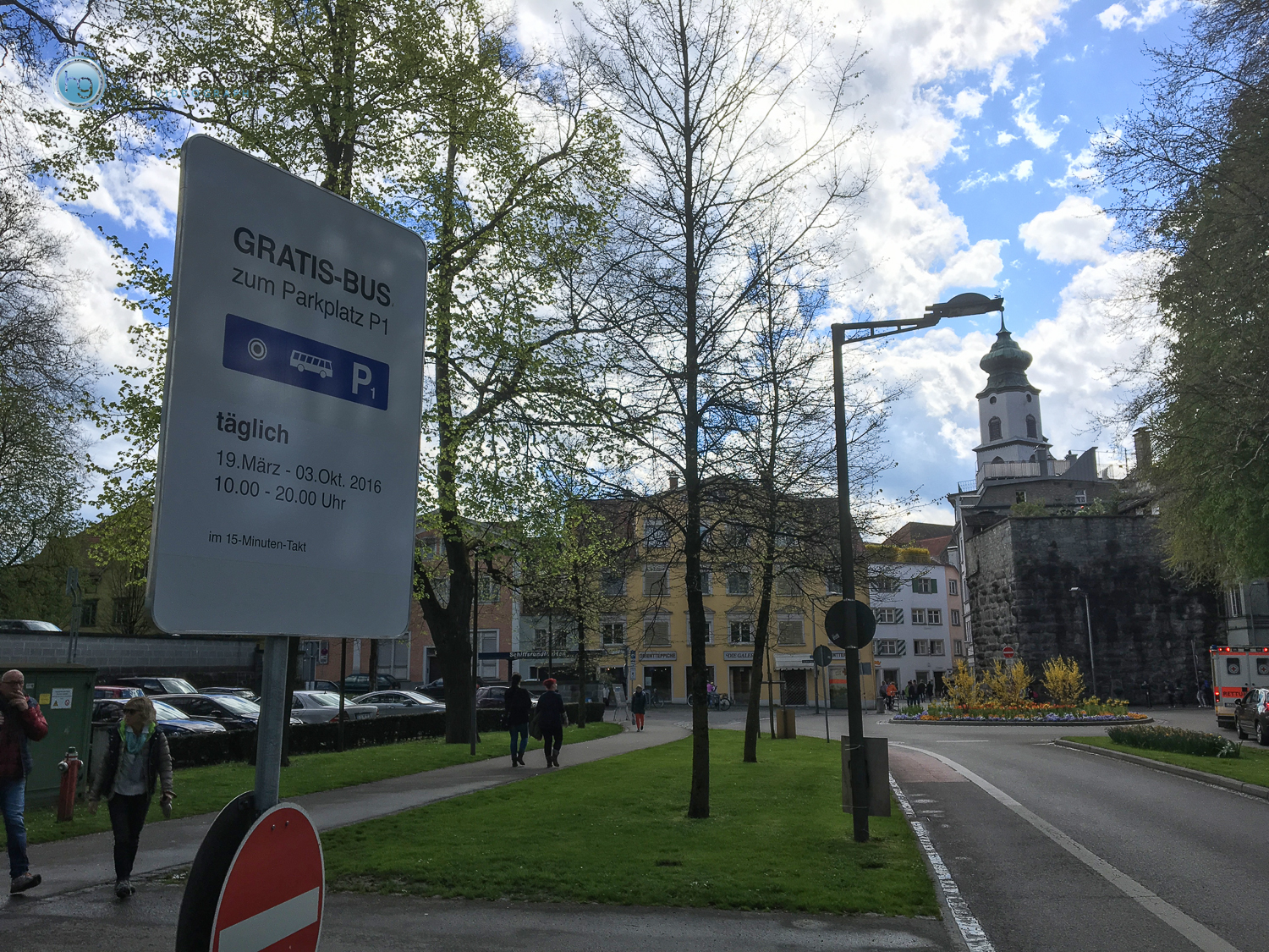 Dank des Kreisverkehrs ist das Wenden kein Problem. Die in Lindau sehr gute Beschilderung von Stell- und Parkplätzen weist auf den ganz in der Nähe gelegenen großen Parkplatz (P1) hin. Von dort kommt man per Bus bequem in wenigen Minuten auf die Insel. Das Busticket ist sowohl in der Parkgebühr enthalten wie auch in der Gästekarte, die wir vom Campingplatz ausgehändigt bekommen haben.