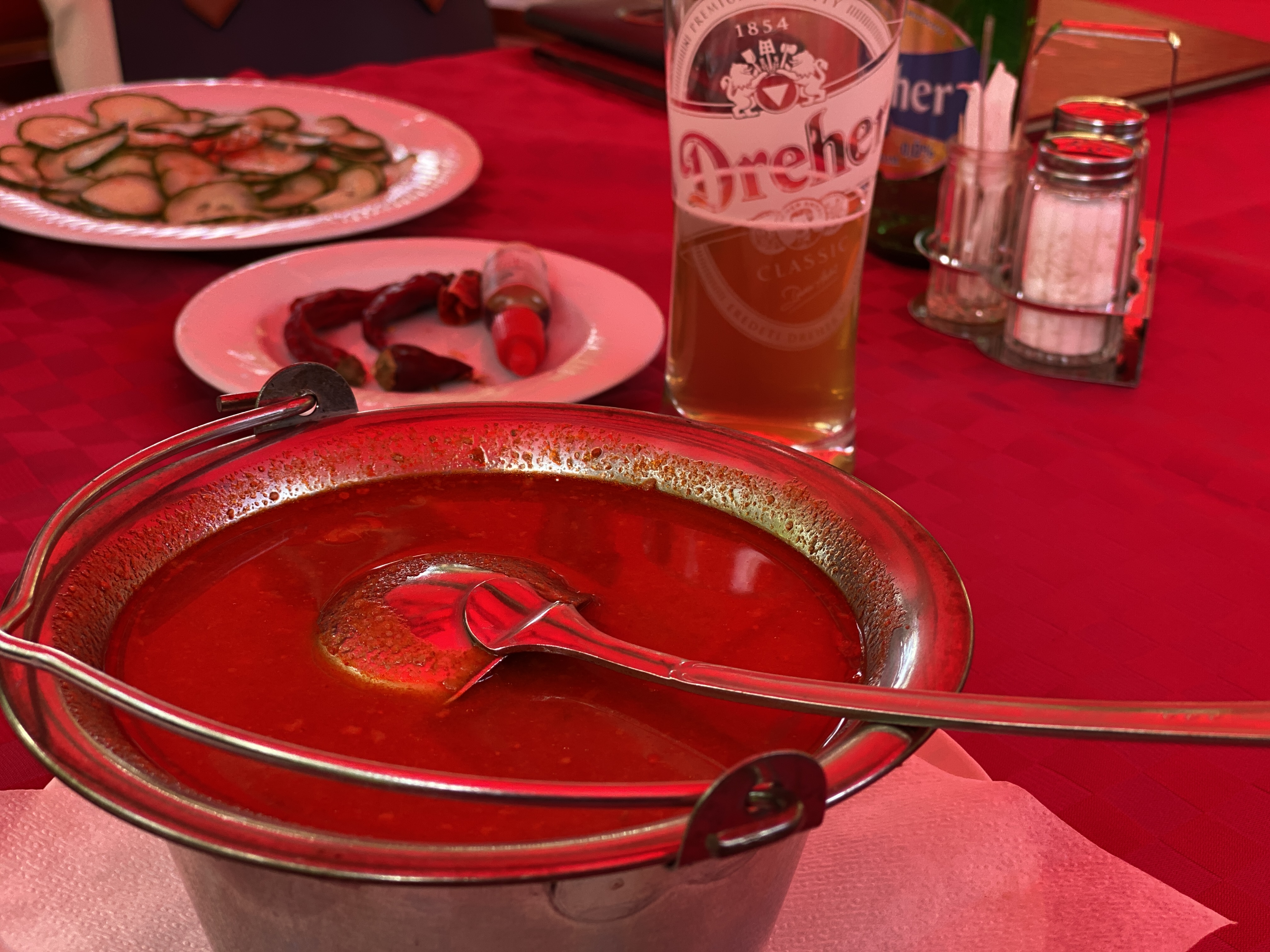 Gute ungarische Küche mit Terrasse in zentraler Lage nahe Thermalbad und Fußgängerzone, Fischsuppe mit Wels 2.190 HUF, Glas Wein 1dl 400 HUF, Espresso 400 HUF (Stand 2023)
