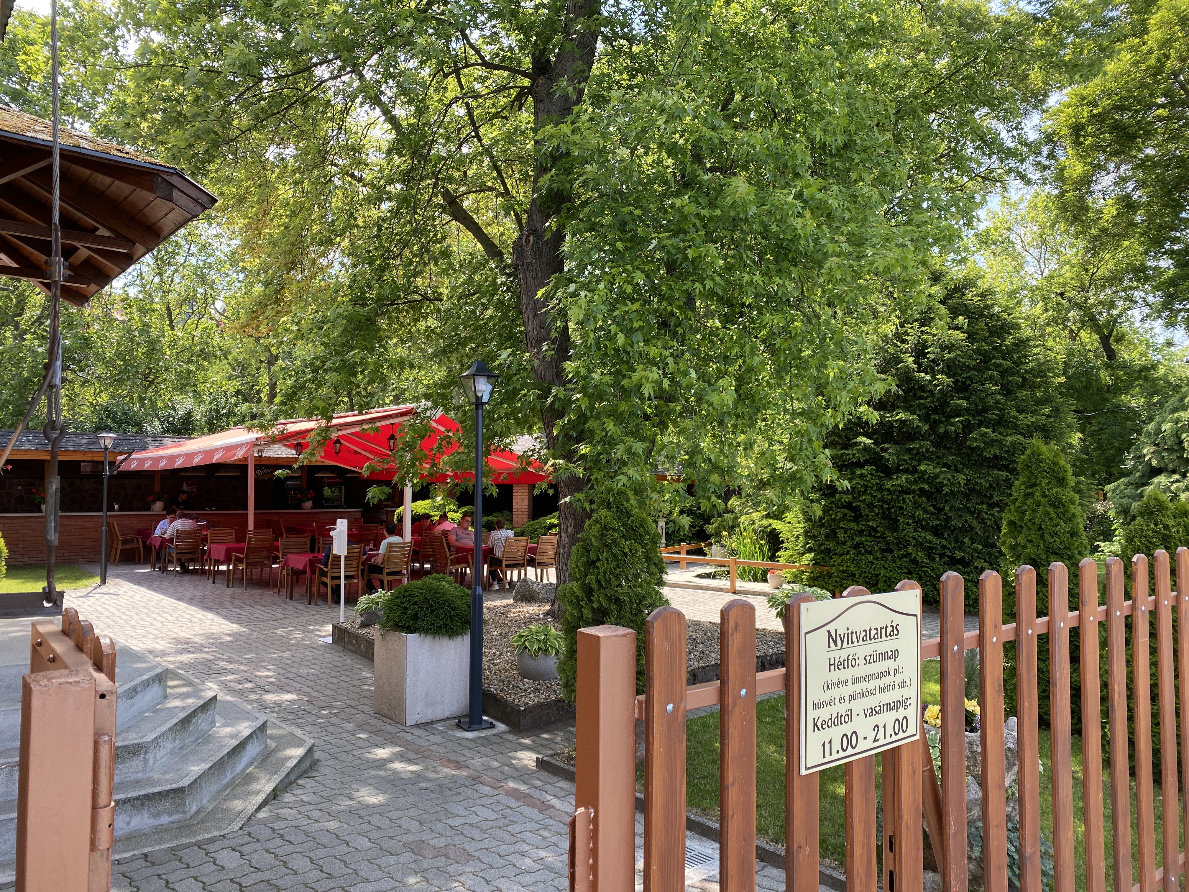 Traditionell eingerichtetes Restaurant mit guter ungarischer Küche und Terrasse gegenüber dem Thermalbad, Welsgulasch (Harcsapaprikás) mit Nudeln 3.990 HUF, Soproni Bier 790 HUF (Stand 2022)