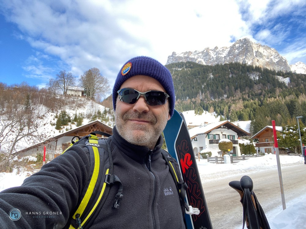 Abseits der Piste gehen wir in Richtung Ehrwalder Alm. Die Tour beginnt an der Talstation der Umlaufbahn. Sie verläuft zunächst entlang der Piste und dann durch den Wald. Es gibt schon Spuren in denen es sich einigermaßen einfach gleite und aufsteigen lässt. Wichtig: nicht die Skier anheben. Doch das passiert mir ständig. Und das kostet Kraft. Allerdings habe ich nicht das leichteste Material. Abfahrt-orientiert nennt man das. Und die „normalen“ Skistiefel sind natürlich auch deutlich schwerer und weniger komfortabel für den Aufstieg.