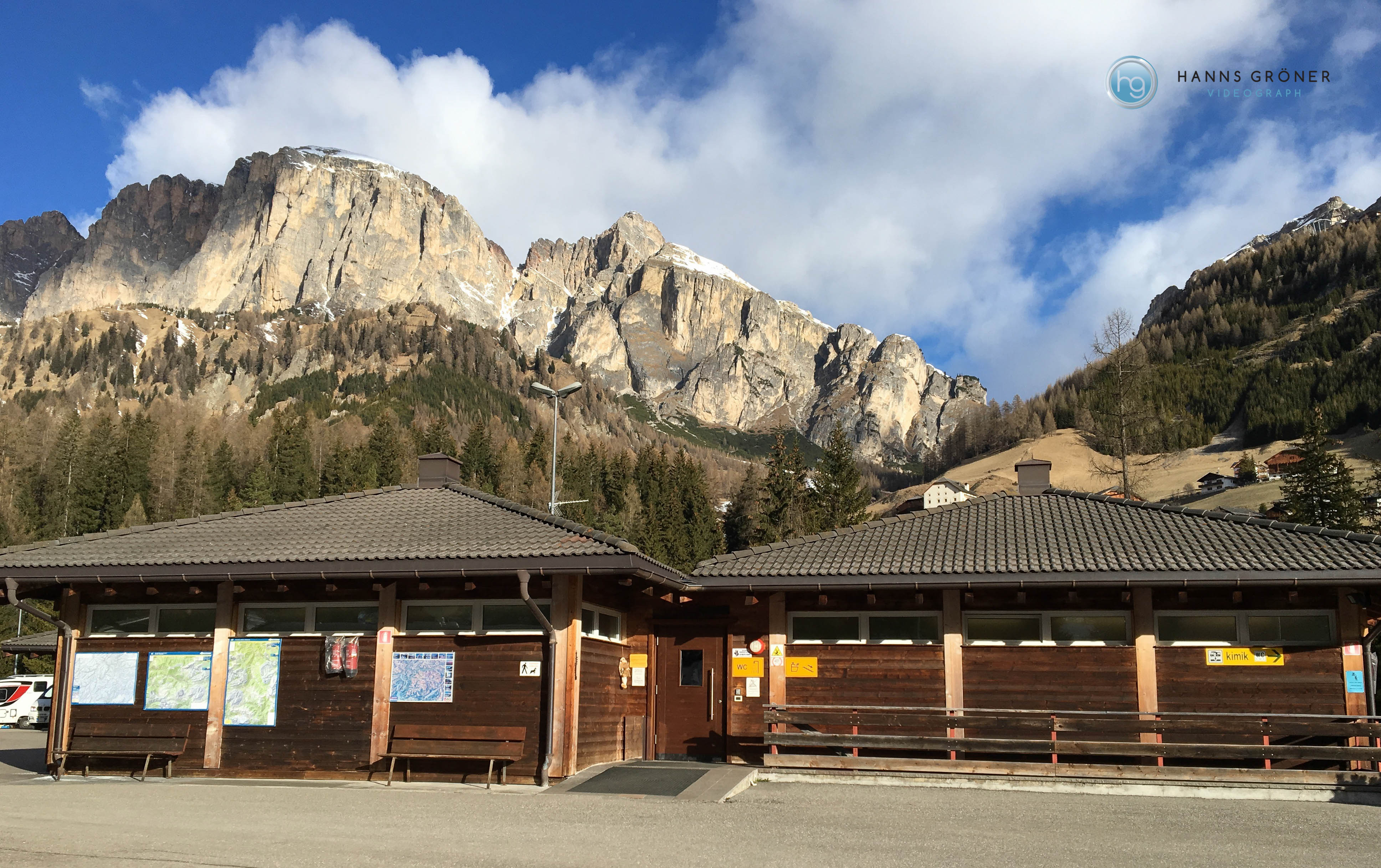 Praktischer und für Bergsportler sehr gut gelegener Stellplatz zwischen Wolkenstein und Sellajoch.