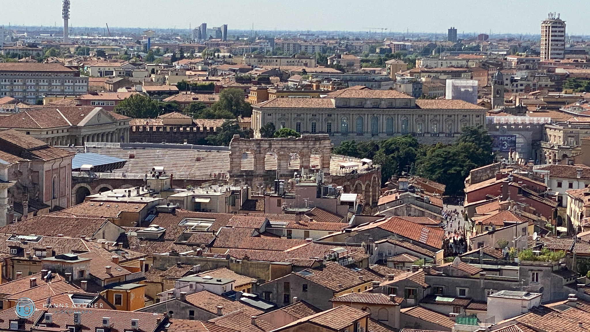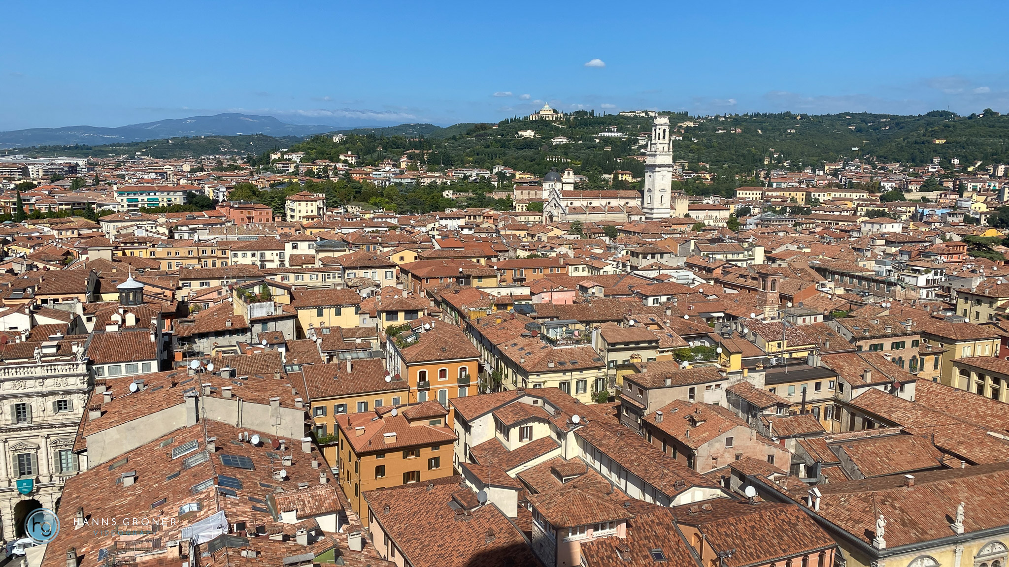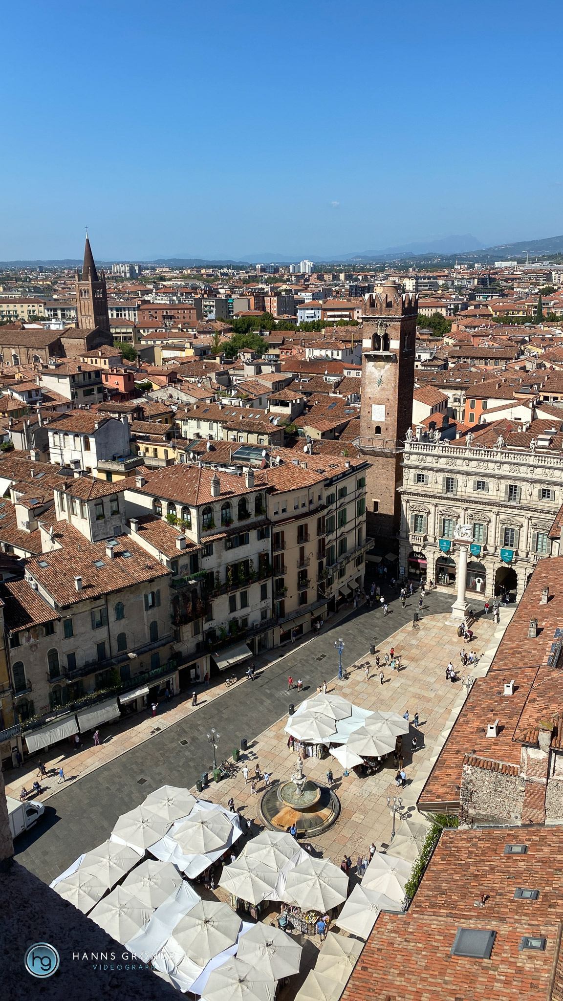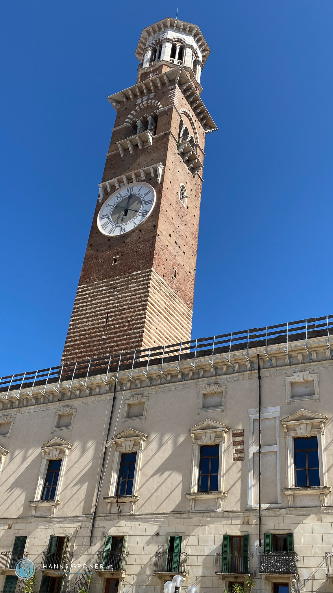 Wenige Schritte von der Nordseite der Piazza delle Erbe liegt der Eingang zum Glockentrum. Für einen schönen Blick über die Altstadt bis hinüber zu den Bergen rund um den Gardasee loht sich der Besuch (6 Euro – inklusive Fahrt mit dem Lift).