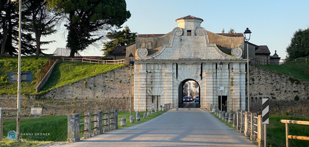 Von Grado fahren wir in einer halben Stunde nach Palmanova (etwa 5.000 Einwohner). Der sternförmig angelegte Grundriss fasziniert mich. Über das südliche Zufahrttor – eines von drei Zugängen zum Zentrum – erreichen wir den Hauptplatz. Parken ist kein Problem – ein Restaurant zu finden schon eher. Im Restaurant Al Gambero essen wir sehr gut zu Abend.
